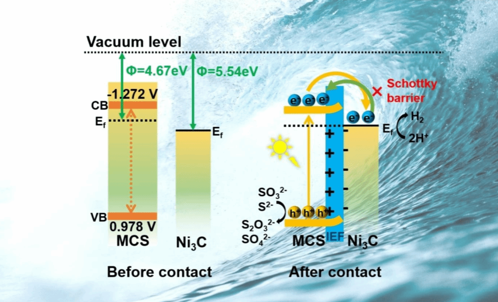近日,国际期刊《Journal of Colloid and Interface Science》(JCIS,2024年影响因子9.7)发表了我院石磊老师的题目为《High-efficiency photocatalytic H2-evolution in water/seawater over a novel noble metal free Ni3C/Mn0.5Cd0.5S Schottky junction》研究成果(DOI: 10.1016/j.jcis.2024.08.219)。该工作提出了一种新型无贵金属Ni3C/Mn0.5Cd0.5S(NCMCS)肖特基结光催化剂。该催化剂具有优异的可见光响应和光生载流子分离特性。实验结果显示,该催化剂在模拟海水中实现了高达6472.9 μmol h-1 g-1的氢气生成速率,是单一Mn0.5Cd0.5S(MCS)的11倍。更为引人注目的是,该催化剂在自然河水、地下水和自来水中的氢气生成速率同样表现出色,显著提升了其实际应用的广泛性。最后,通过实验和理论计算相结合的方法,揭示了氢气生成的潜在机制,为该光催化剂的实际应用提供了理论支持。