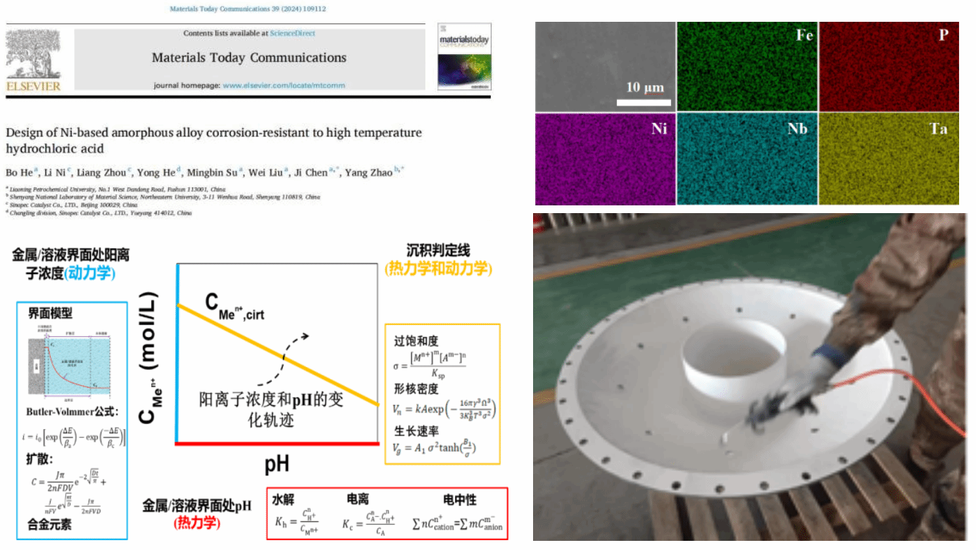 针对能源装备材料腐蚀与防护技术的迫切需求,团队基于先进非晶合金设计理念,研制出耐高温浓盐酸的新型镍基非晶合金 Ni50Nb14Ta14P9Fe13。在此基础上,系统揭示了非晶合金的耐蚀机理,阐明了结晶动力学与腐蚀性能之间的内在关联,进而构建了较为完善的腐蚀防护理论体系。工程应用方面,采用超音速火焰喷涂(HVOF)与大气等离子喷涂(APS)复合工艺,在碳钢基体表面制备“镍基非晶合金/氧化铝”双层复合涂层,并在中国石化催化剂有限公司长岭分公司尾气处理系统的高温苛刻工况下完成累计 14600 小时工业验证。结果表明,小饱和器塔顶盖的服役寿命较原哈氏 C276 合金材料提升67%。该成果实现了关键耐蚀材料与防护技术的协同创新,不仅促进企业年降本增效超千万元,也有效提升了催化剂行业装置运行的可靠性与产业链安全保障能力。同时,该方案在石油化工、催化剂制备以及低温余热回用(盐酸回用)等场景具有良好的迁移与推广潜力,为破解高温耐蚀合金领域的“卡脖子”难题提供了可复制、可扩展的创新路径。